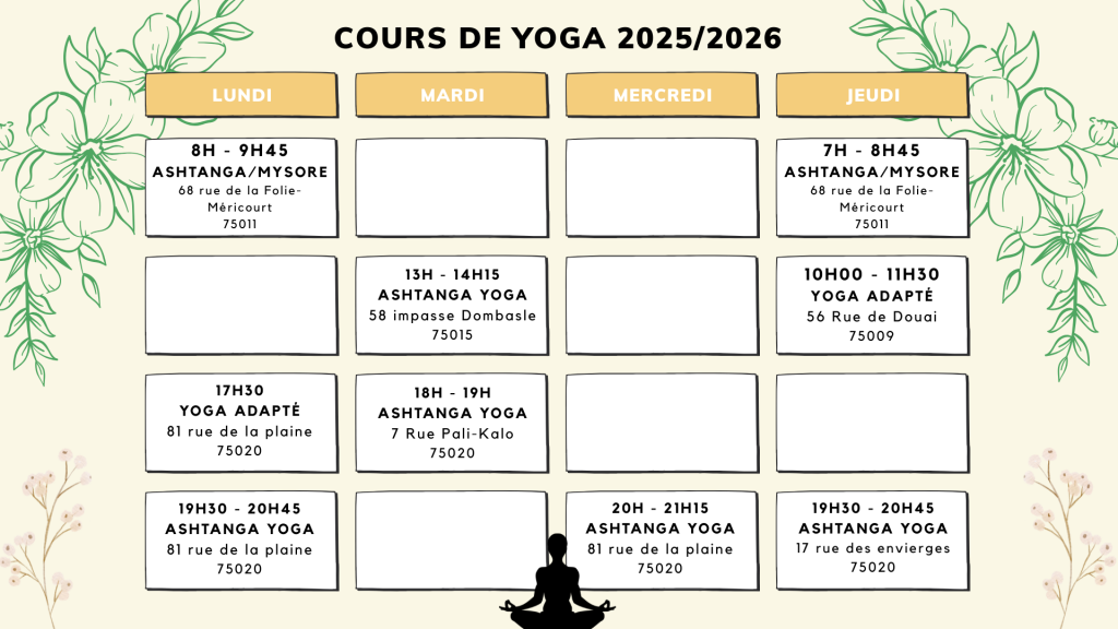 Les cours s’adressent à tous et à toutes et ne nécessitent pas d’avoir une pratique antérieure de yoga. Virginie a été formée à l’Institut De Gasquet.